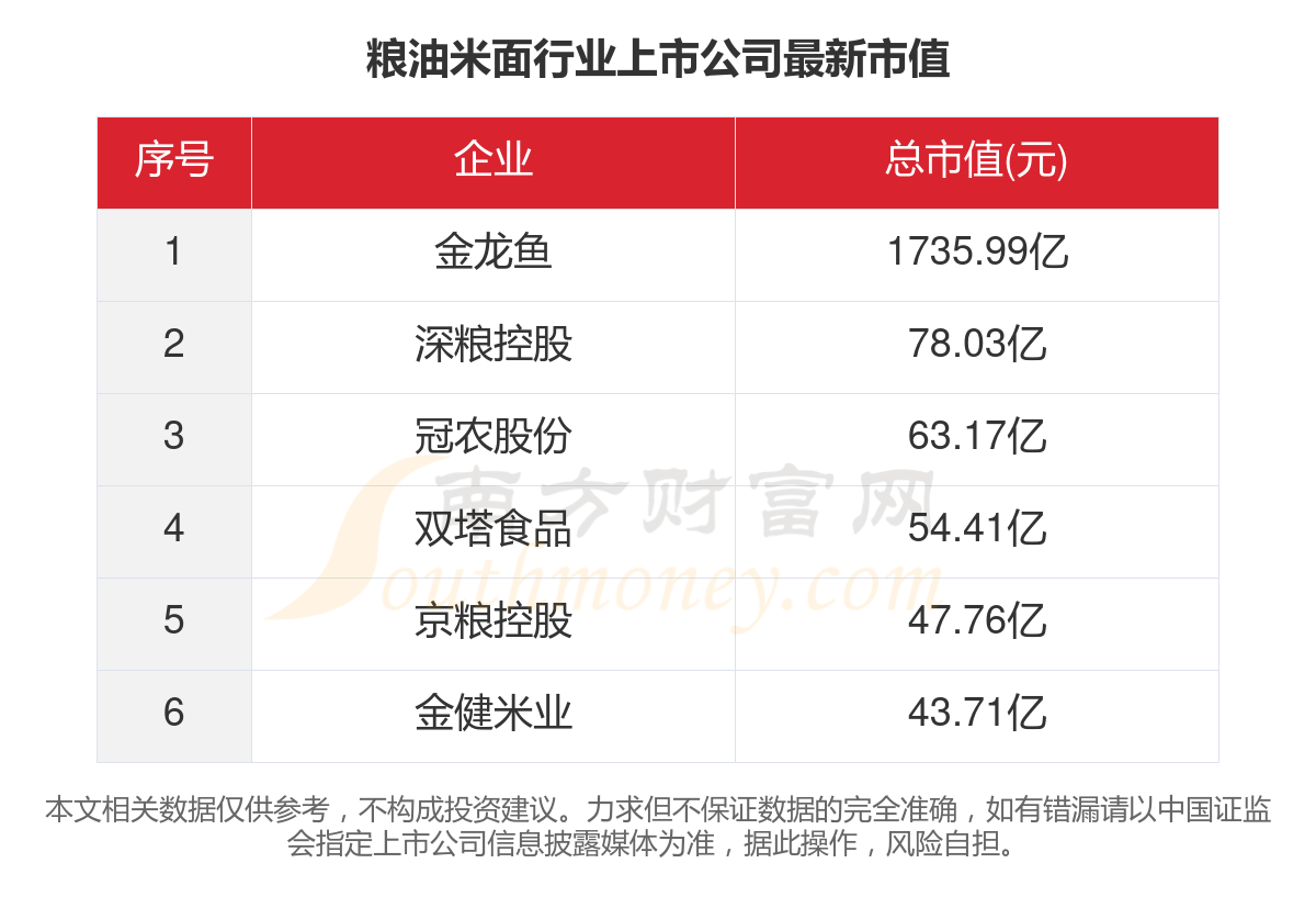 根据3月20日的收盘价格,A股6家粮油米面行业上市公司的当前总市值合计为2023.06亿元。其中,市值最高的三家粮油米面行业上市公司为:金龙鱼、深粮控股、冠农股份。