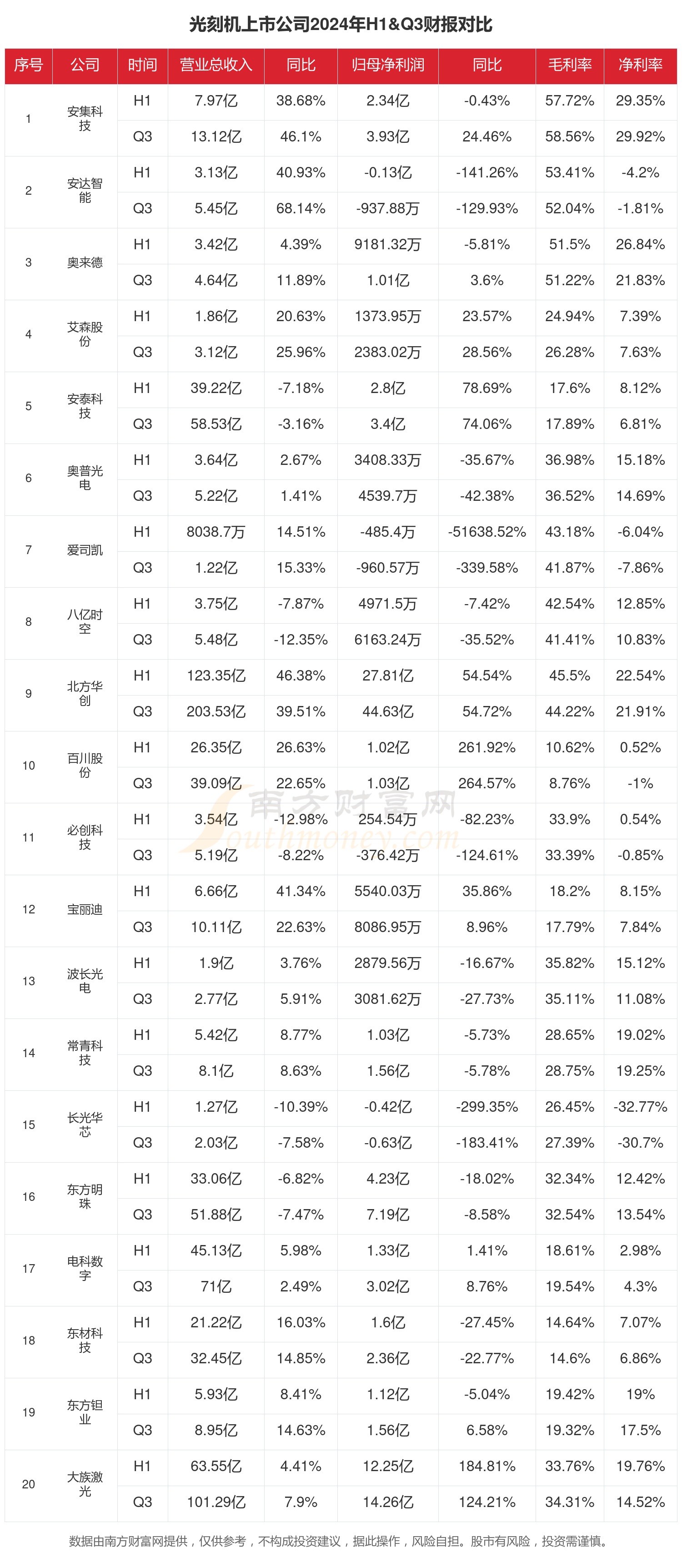 光刻机行业现状:2024年前三季度相关上市公司财报对比