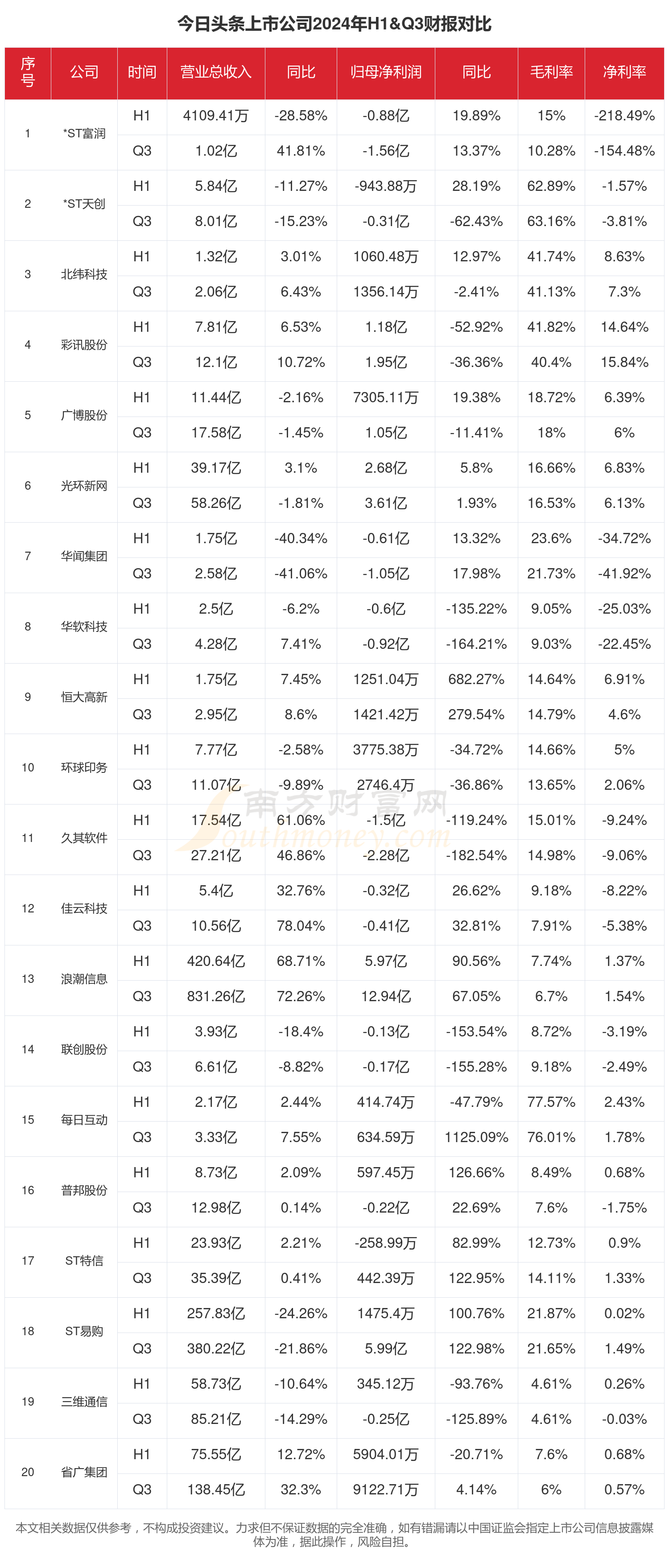 今日头条行业现状:2024年前三季度相关上市公司财报对比