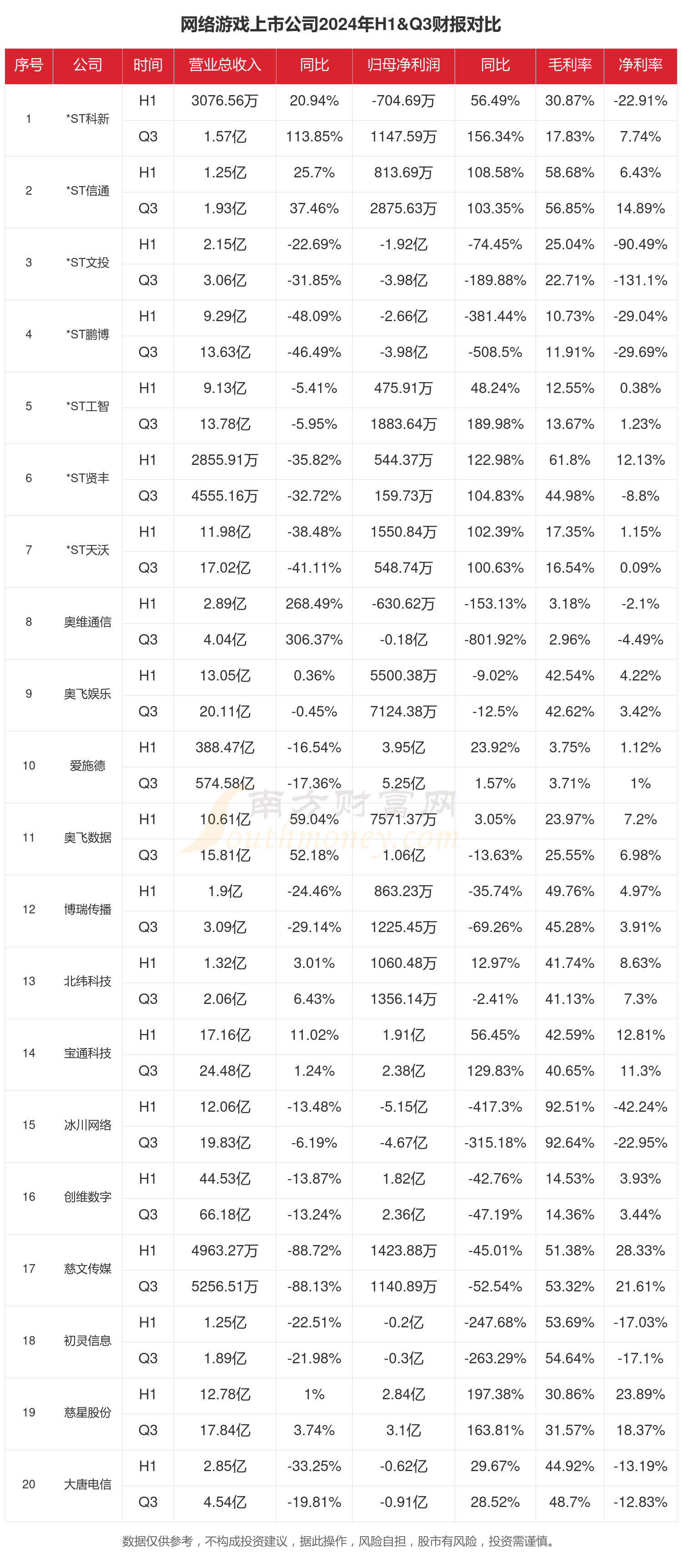 网络游戏行业现状:2024年前三季度相关上市公司财报对比