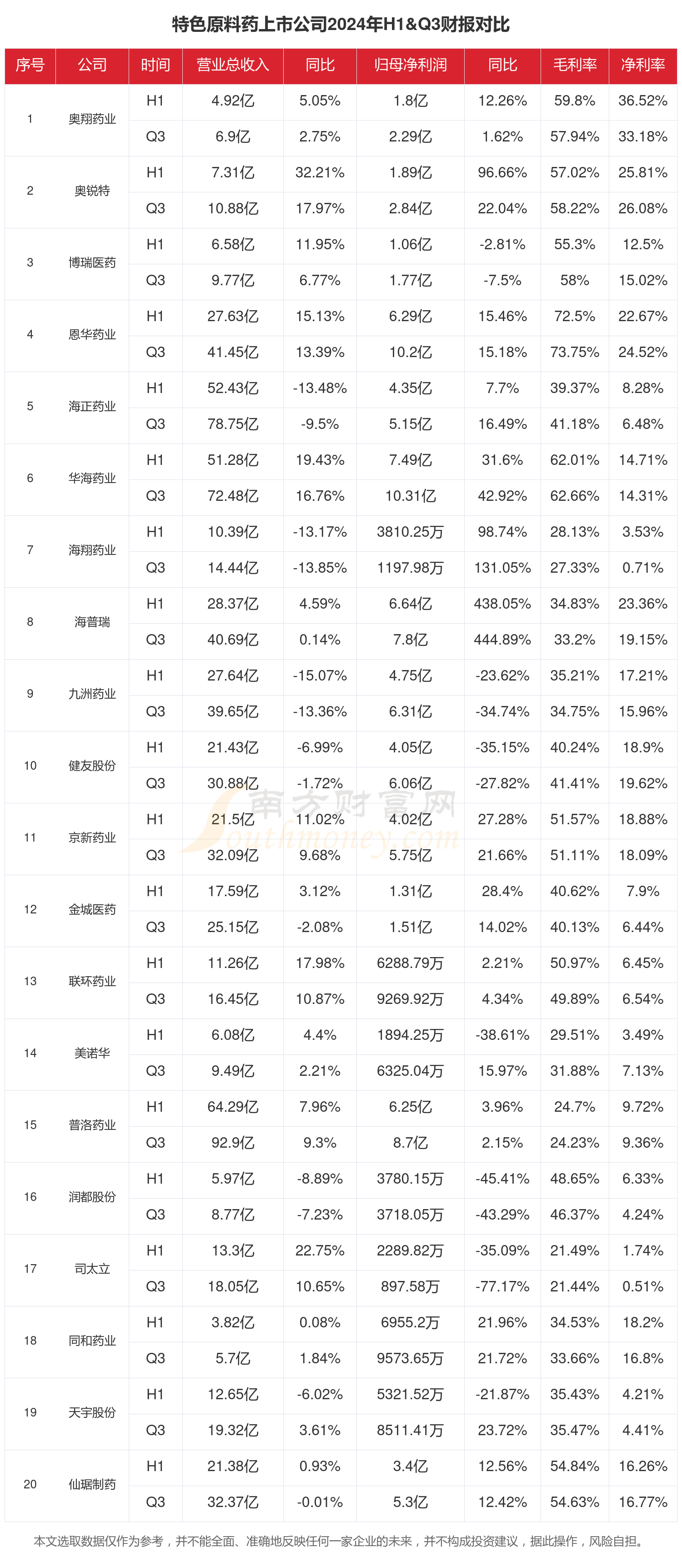 根据南方财富网概念查询工具数据统计,A股21家特色原料药相关上市公司已发布2024年前三季度财报。2024年前三季度大家都过得怎么样?一起来看看吧。