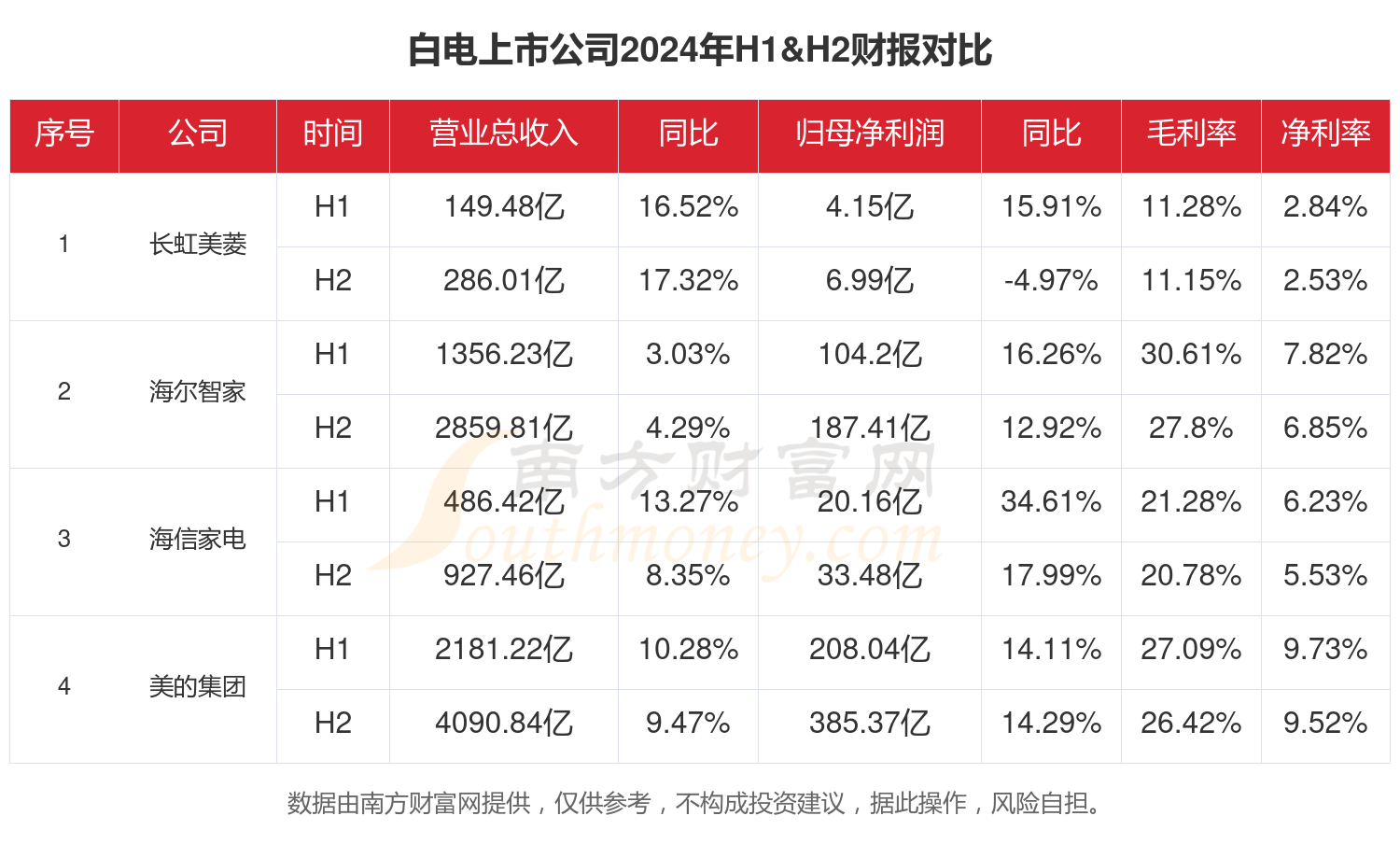 根据南方财富网概念查询工具数据统计,A股9家白电相关上市公司已发布2024年全年财报。2024年全年大家都过得怎么样?一起来看看吧。