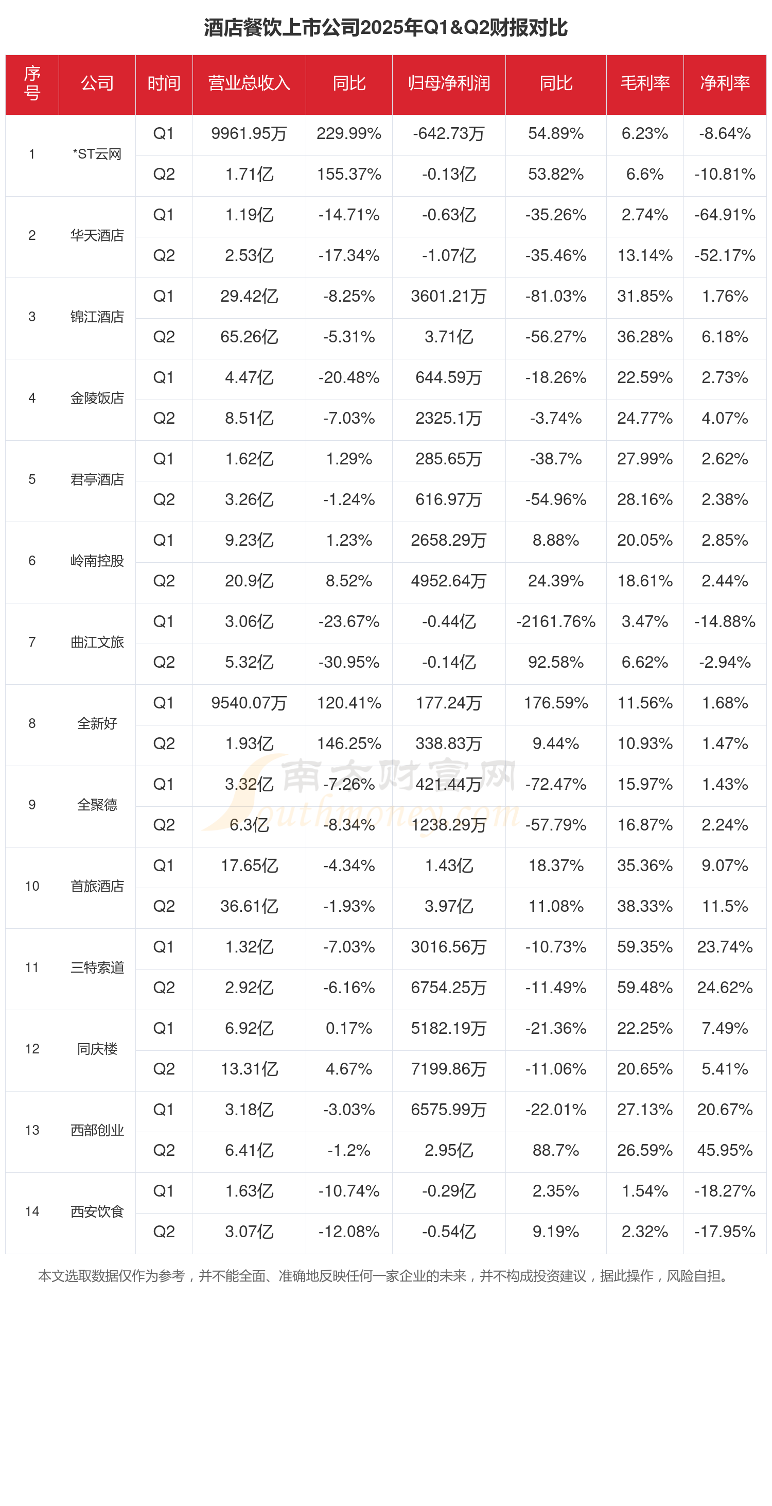 根据南方财富网概念查询工具数据统计,A股14家酒店餐饮相关上市公司已发布2025年上半年财报。2025年上半年大家都过得怎么样?一起来看看吧。