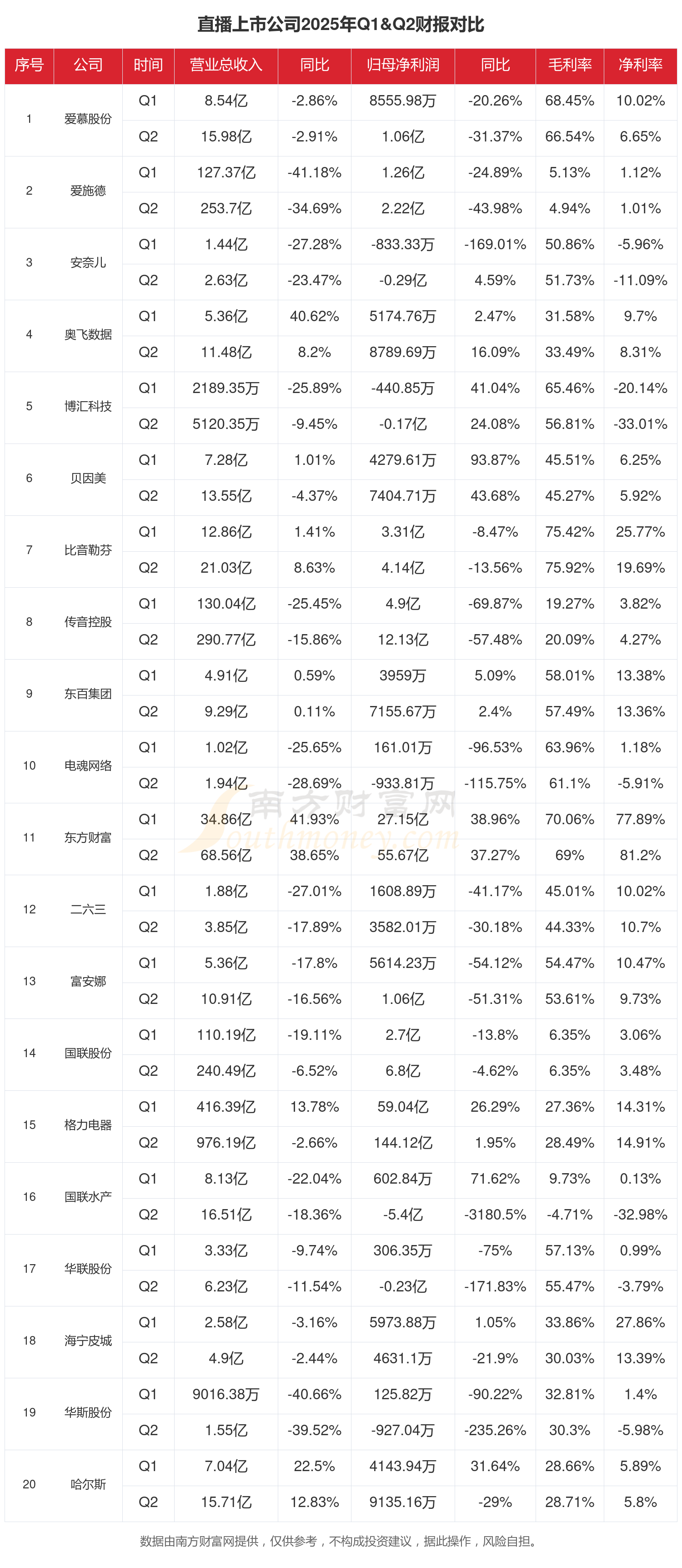 根据南方财富网概念查询工具数据统计,A股47家直播相关上市公司已发布2025年上半年财报。2025年上半年大家都过得怎么样?一起来看看吧。
