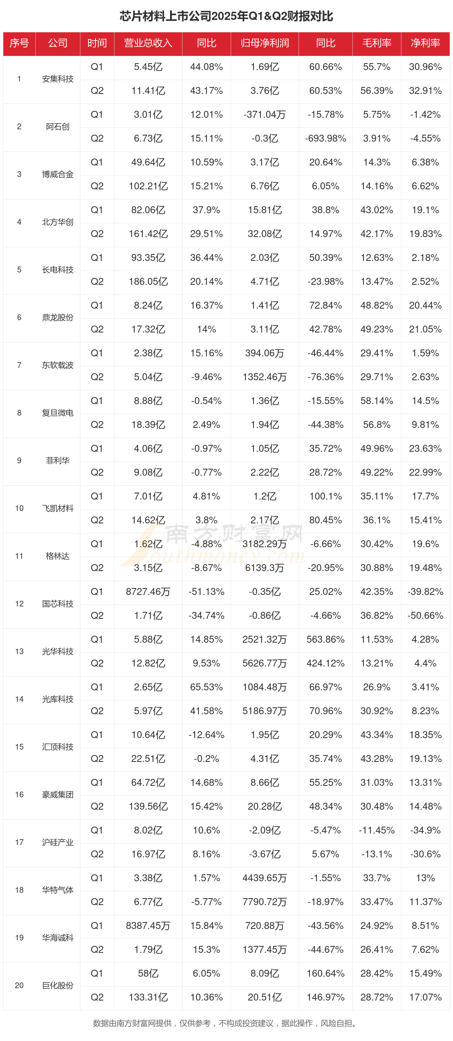 根据南方财富网概念查询工具数据统计,A股45家芯片材料相关上市公司已发布2025年上半年财报。2025年上半年大家都过得怎么样?一起来看看吧。