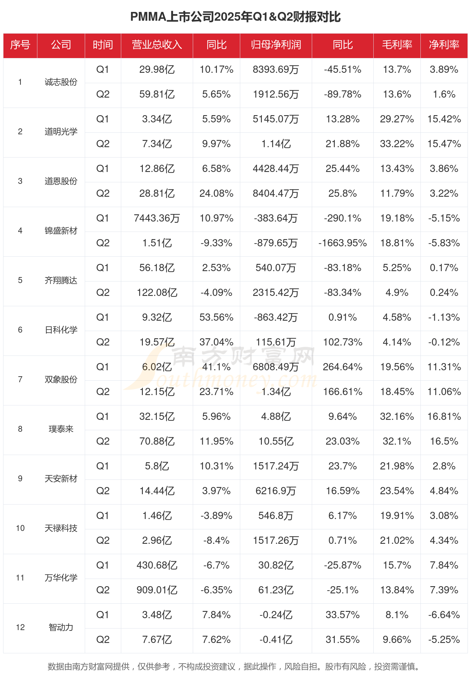 根据南方财富网概念查询工具数据统计,A股12家PMMA相关上市公司已发布2025年上半年财报。2025年上半年大家都过得怎么样?一起来看看吧。