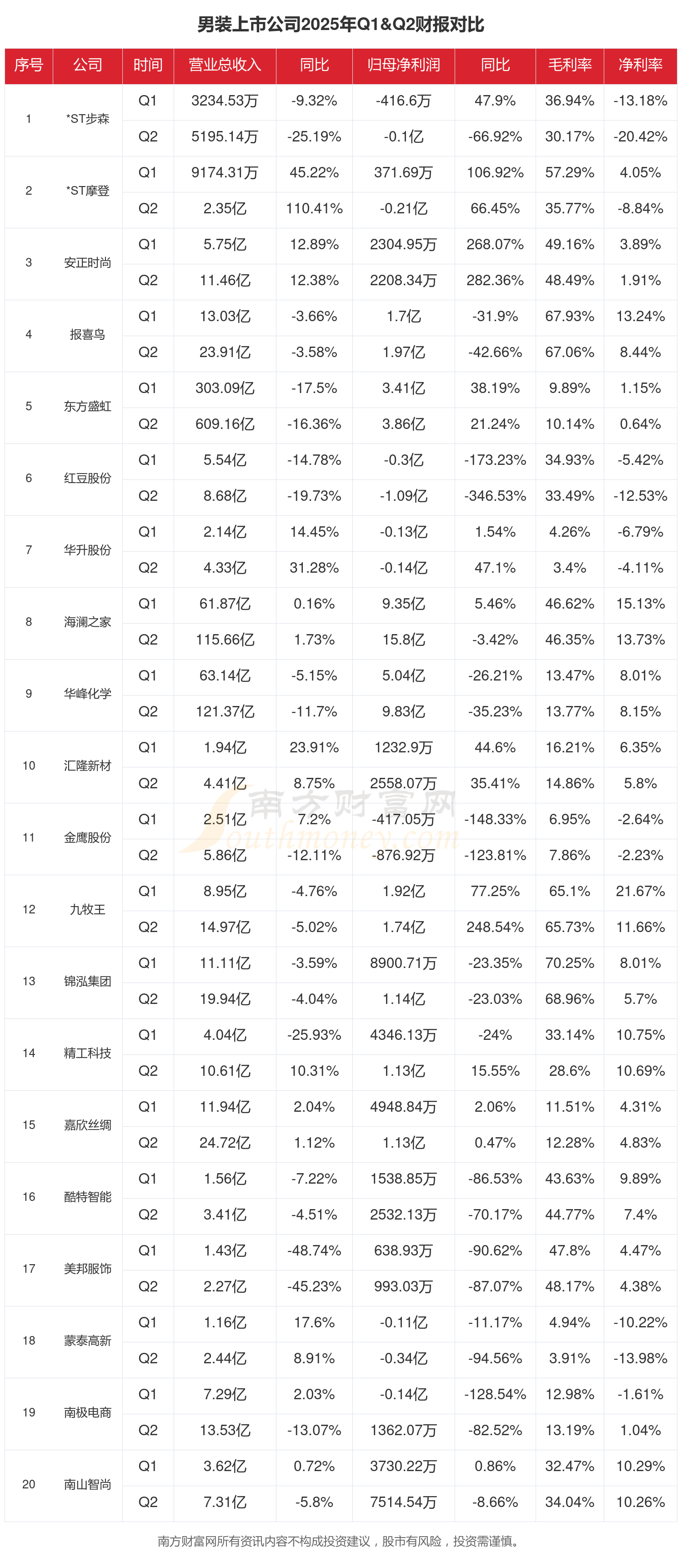 根据南方财富网概念查询工具数据统计,A股38家男装相关上市公司已发布2025年上半年财报。2025年上半年大家都过得怎么样?一起来看看吧。