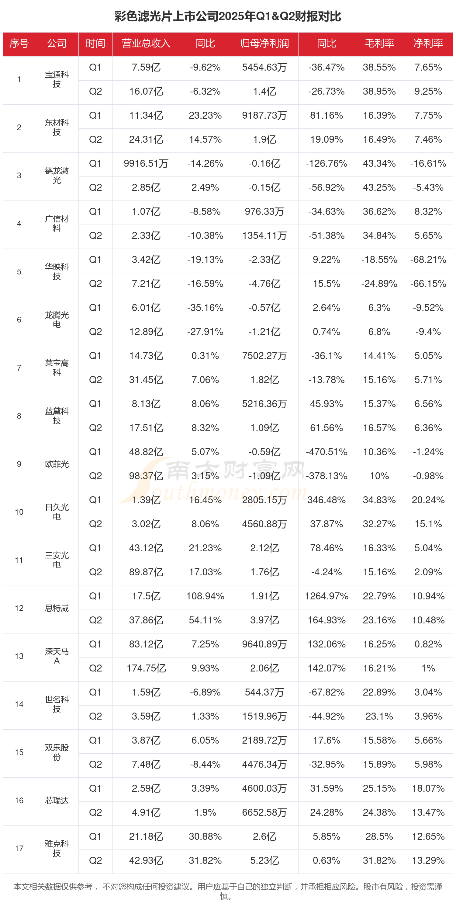根据南方财富网概念查询工具数据统计,A股17家彩色滤光片相关上市公司已发布2025年上半年财报。2025年上半年大家都过得怎么样?一起来看看吧。