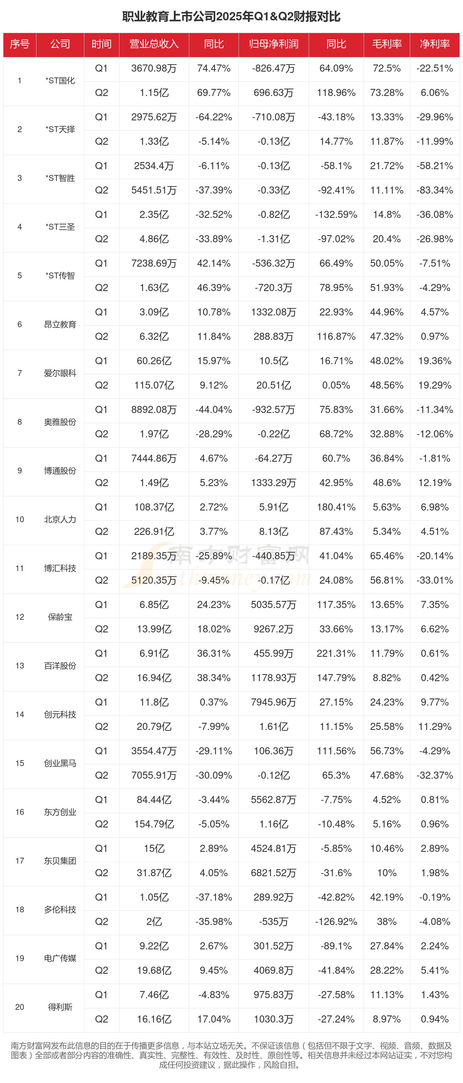 根据南方财富网概念查询工具数据统计,A股115家职业教育相关上市公司已发布2025年上半年财报。2025年上半年大家都过得怎么样?一起来看看吧。