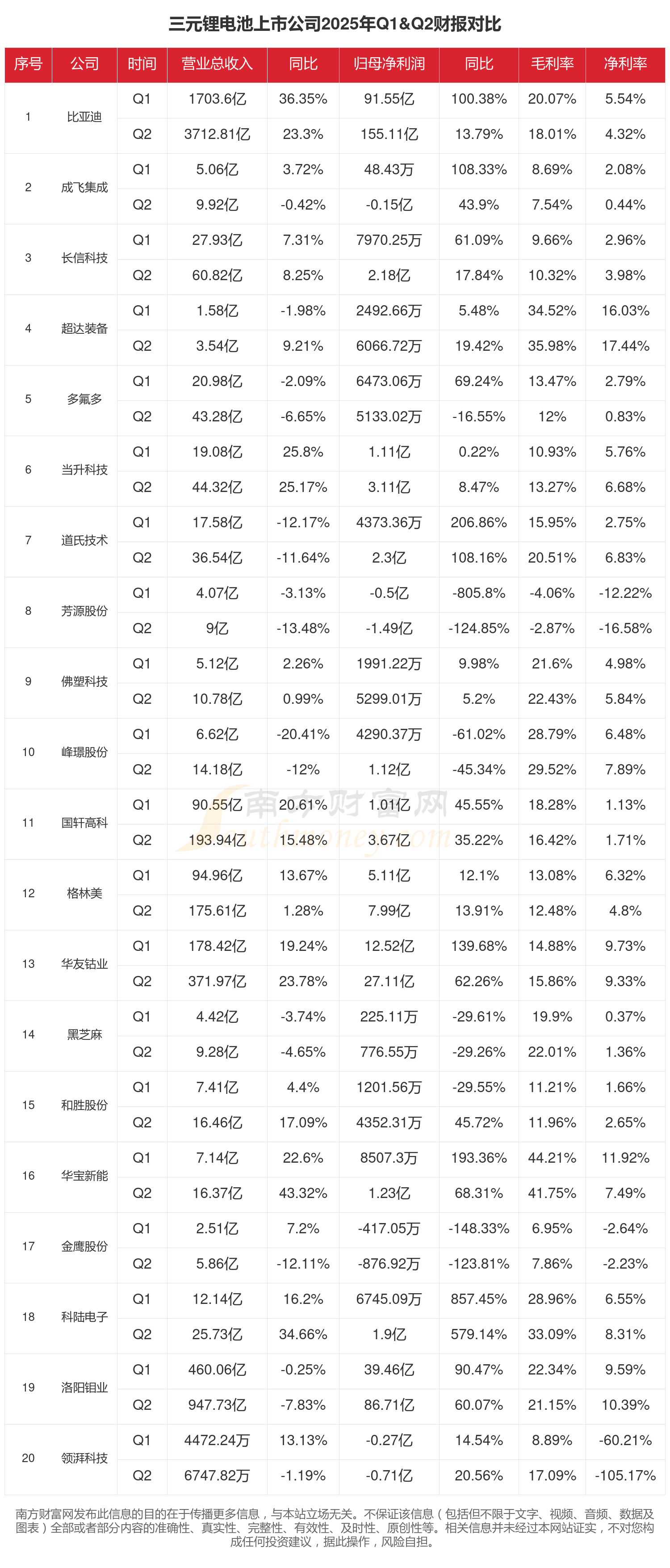 厦钨新能(688778):厦钨新能2025年第二季度营收同比增长47.78%至45.57亿元;净利润为1.9亿,同比增长47.55%,毛利润为4.68亿,毛利率10.26%。