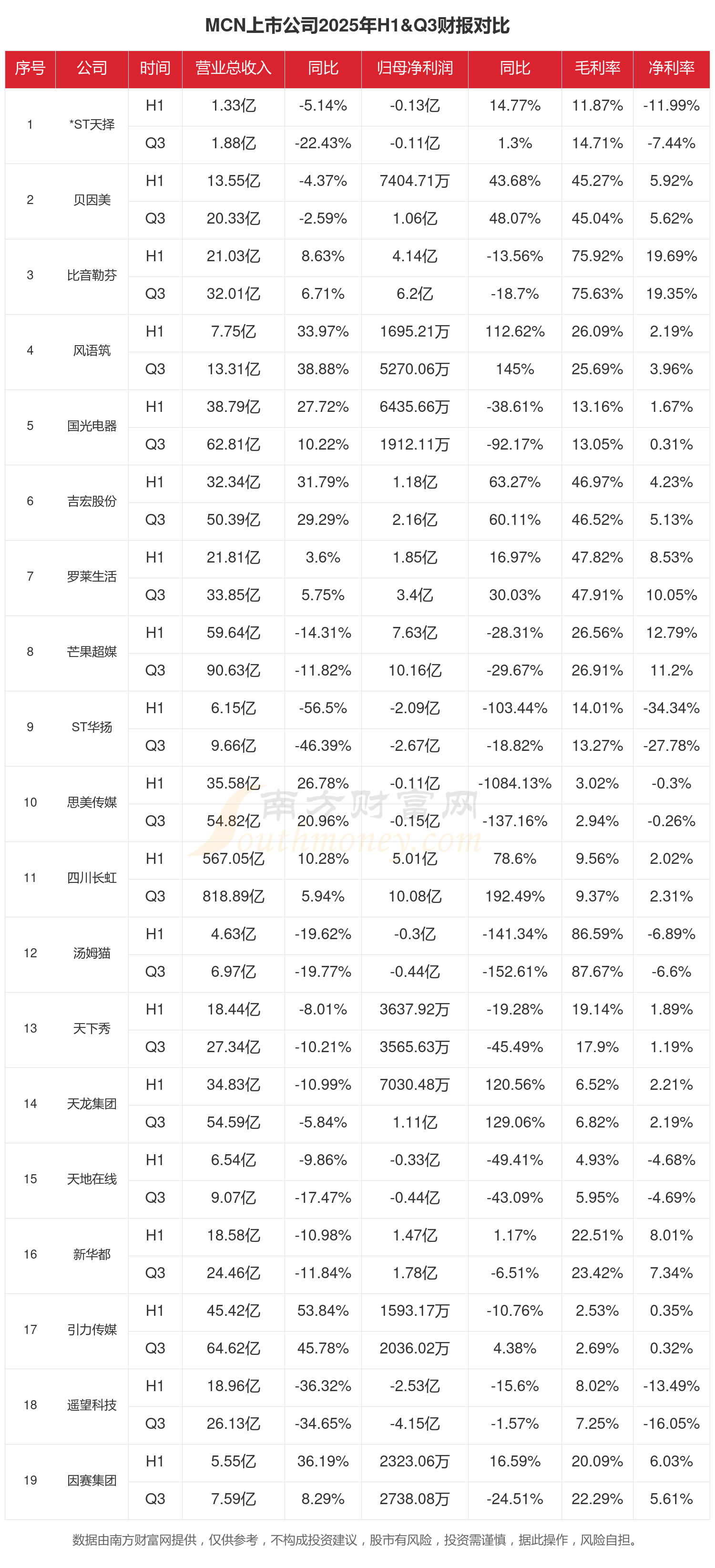 根据南方财富网概念查询工具数据统计,A股19家MCN相关上市公司已发布2025年前三季度财报。2025年前三季度大家都过得怎么样?一起来看看吧。