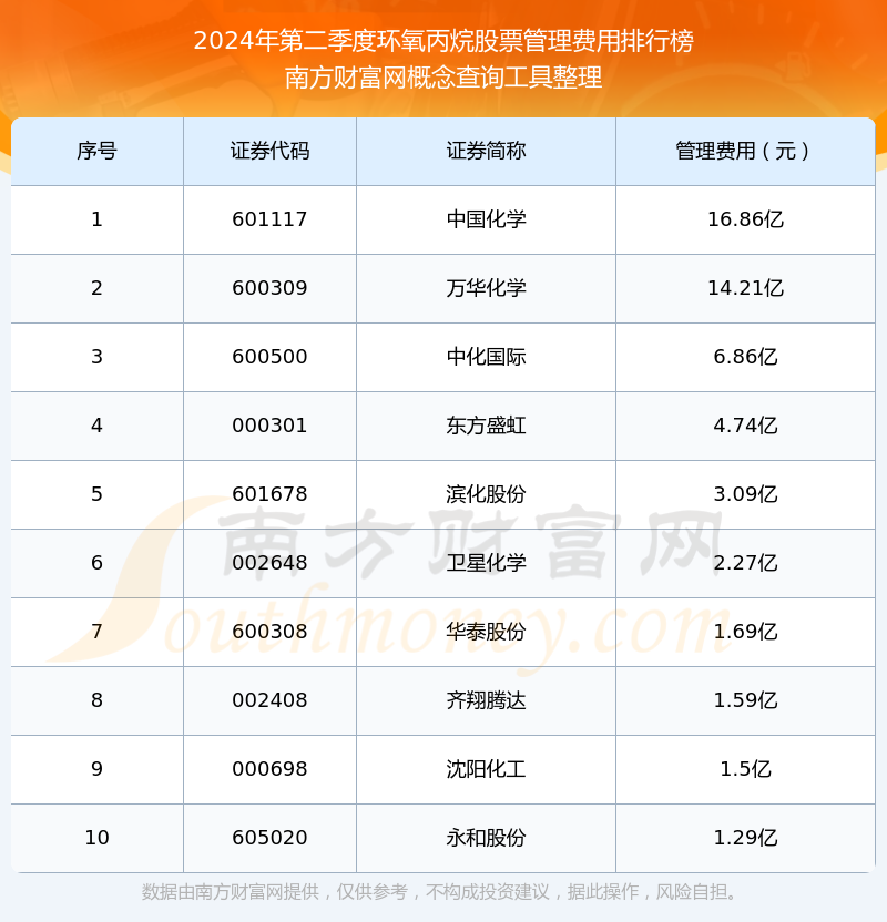2024年第二季度,环氧丙烷股票管理费用排名如下:中国化学(601117)的管理费用总额高达16.86亿,万华化学(600309)和中化国际(600500)位居第二和第三,东方盛虹(000301)、滨化股份(601678)、卫星化学(002648)、华泰股份(600308)、齐翔腾达(002408)、沈阳化工(000698)、永和股份(605020)分别进入前十,其管理费用总额分别排名第4-10名。