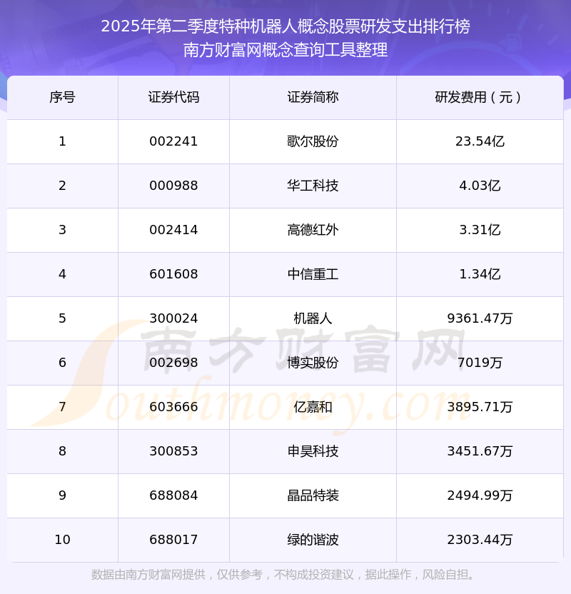 2025年第二季度,特种机器人概念股票研发支出排名如下:歌尔股份(002241)研发支出总额高达23.54亿,华工科技(000988)和高德红外(002414)分别位居第二和第三,中信重工(601608)、机器人(300024)、博实股份(002698)、亿嘉和(603666)、申昊科技(300853)、晶品特装(688084)、绿的谐波(688017)分别进入前十,其研发支出总额分别排名第4-10名。