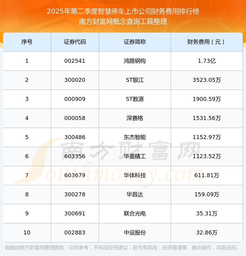 2025年第二季度,智慧停车上市公司财务费用排行榜中,鸿路钢构(002541)财务费用总额高达1.73亿,ST银江(300020)和ST数源(000909)排名第二和第三,深赛格(000058)、东杰智能(300486)、华菱精工(603356)、华体科技(603679)、华昌达(300278)、联合光电(300691)、中设股份(002883)进入前十,财务费用总额分别排名第4-10名。