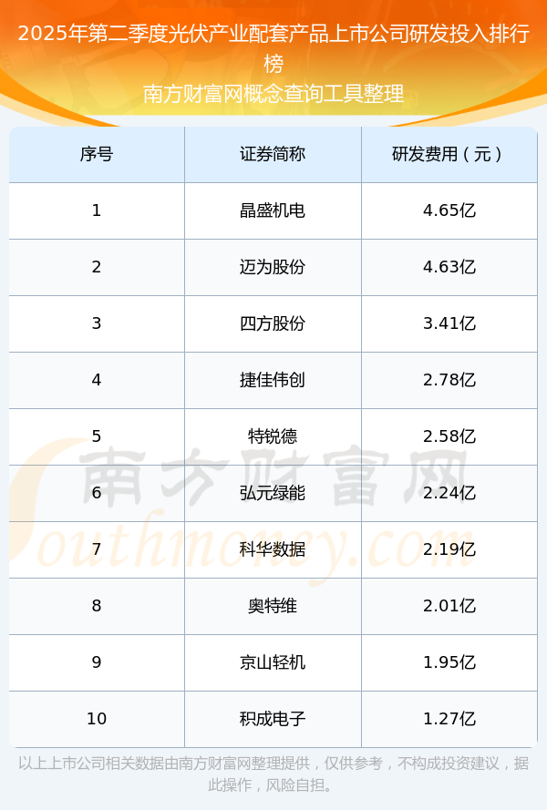 2025年第二季度光伏产业配套产品上市公司研发投入排行榜如下:晶盛机电(300316)研发投入总额高达4.65亿,迈为股份(300751)和四方股份(601126)分别排名第二和第三,捷佳伟创(300724)、特锐德(300001)、弘元绿能(603185)、科华数据(002335)、奥特维(688516)、京山轻机(000821)、积成电子(002339)分别进入前十,其研发投入总额分别排名第4-10名。