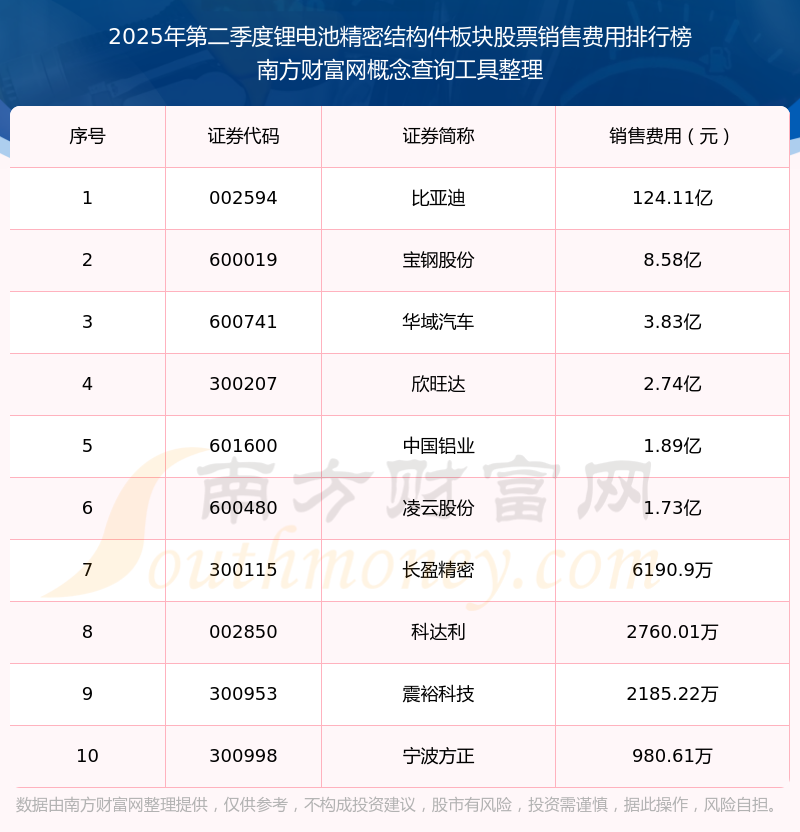 2025年第二季度,锂电池精密结构件板块股票销售费用排行榜如下:比亚迪(002594)的销售费用总额高达124.11亿,宝钢股份(600019)和华域汽车(600741)分别位居第二和第三,欣旺达(300207)、中国铝业(601600)、凌云股份(600480)、长盈精密(300115)、科达利(002850)、震裕科技(300953)、宁波方正(300998)分别进入前十,其销售费用总额分别排名第4-10名。