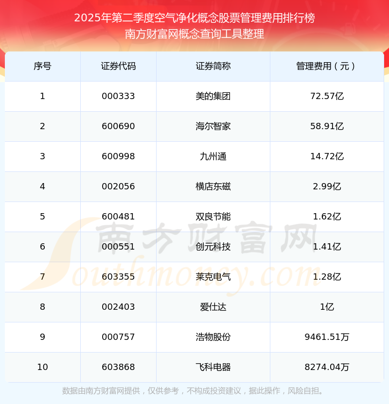 2025年第二季度,空气净化概念股票管理费用排名如下:美的集团(000333)的管理费用总额高达72.57亿,海尔智家(600690)和九州通(600998)位居第二和第三,横店东磁(002056)、双良节能(600481)、创元科技(000551)、莱克电气(603355)、爱仕达(002403)、浩物股份(000757)、飞科电器(603868)分别进入前十,其管理费用总额分别排名第4-10名。