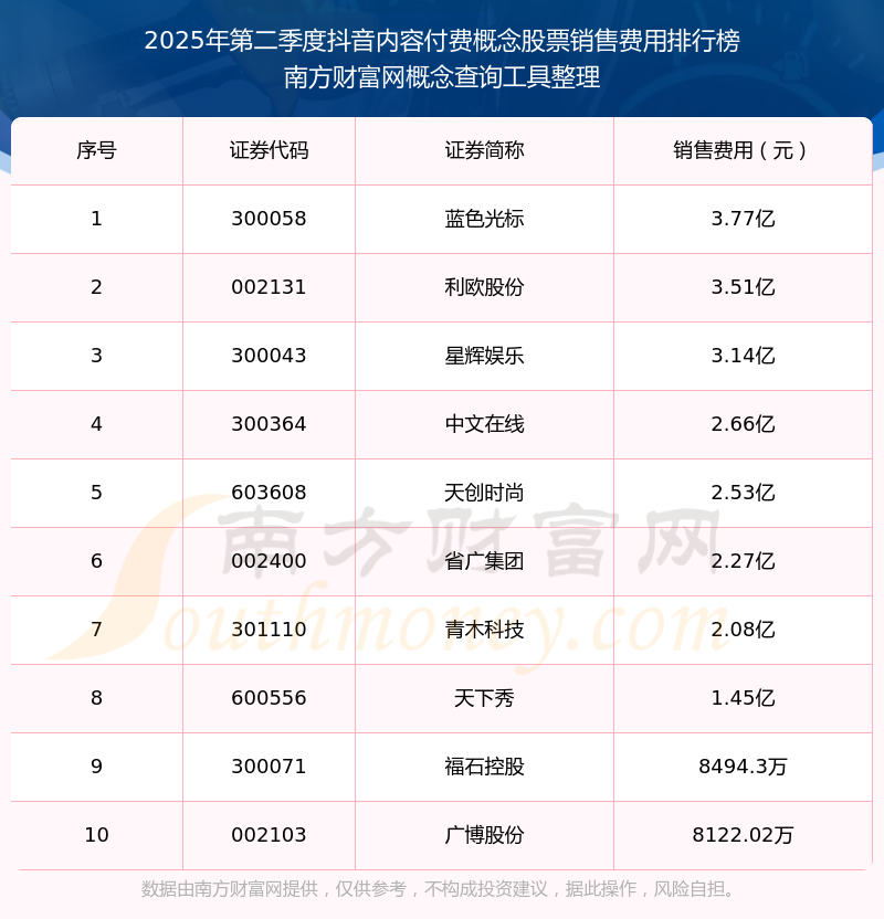 2025年第二季度,抖音内容付费概念股票销售费用排名中,蓝色光标(300058)销售费用总额高达3.77亿,利欧股份(002131)和星辉娱乐(300043)排名第二和第三,中文在线(300364)、天创时尚(603608)、省广集团(002400)、青木科技(301110)、天下秀(600556)、福石控股(300071)、广博股份(002103)进入前十,销售费用总额分别排名第4-10名。