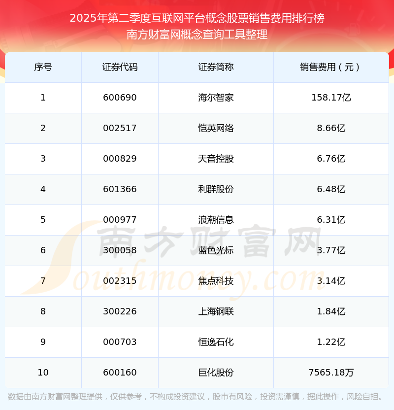 2025年第二季度,互联网平台概念股票销售费用排行榜如下:海尔智家(600690)的销售费用总额高达158.17亿,恺英网络(002517)和天音控股(000829)分别位居第二和第三,利群股份(601366)、浪潮信息(000977)、蓝色光标(300058)、焦点科技(002315)、上海钢联(300226)、恒逸石化(000703)、巨化股份(600160)分别进入前十,其销售费用总额分别排名第4-10名。