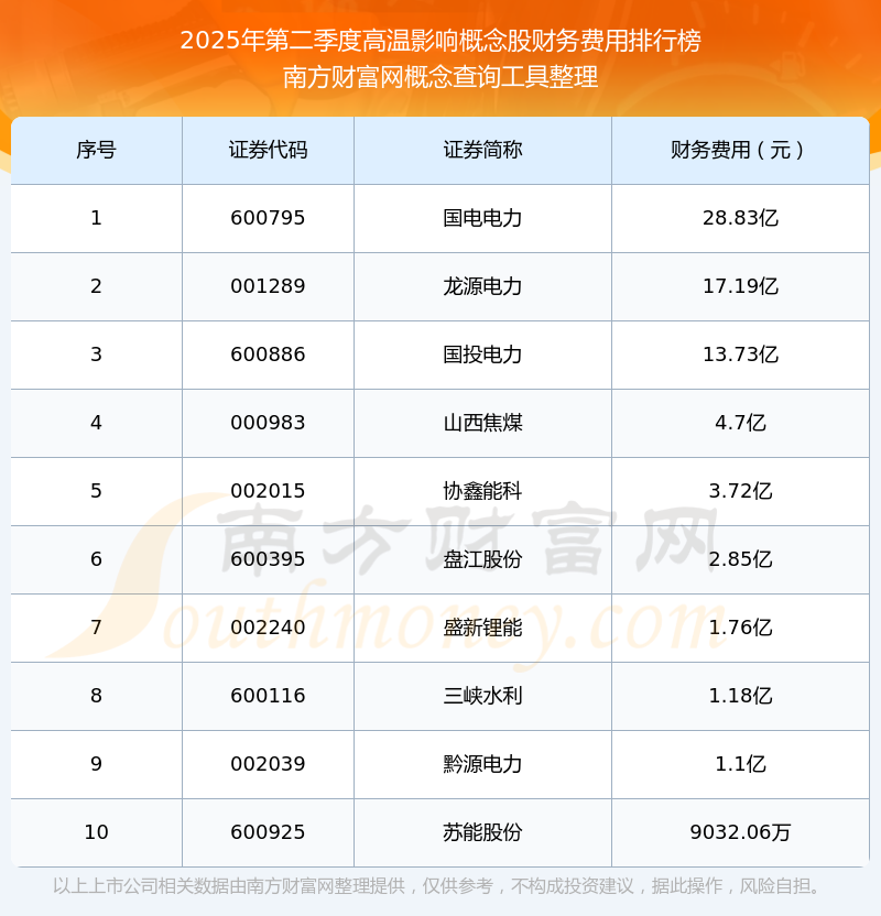 2025年第二季度,高温影响概念股财务费用排行榜中,国电电力(600795)财务费用总额高达28.83亿,龙源电力(001289)和国投电力(600886)位居第二和第三,山西焦煤(000983)、协鑫能科(002015)、盘江股份(600395)、盛新锂能(002240)、三峡水利(600116)、黔源电力(002039)、苏能股份(600925)进入前十,财务费用总额分别排名第4-10名。