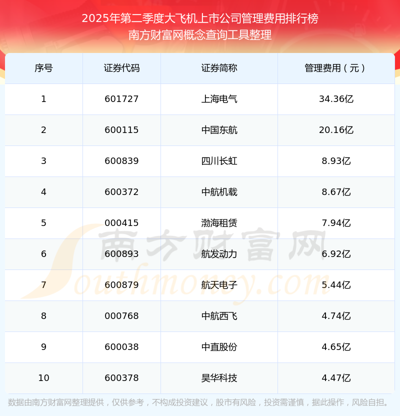 2025年第二季度,大飞机上市公司管理费用排名如下:上海电气(601727)的管理费用总额高达34.36亿,中国东航(600115)和四川长虹(600839)位居第二和第三,中航机载(600372)、渤海租赁(000415)、航发动力(600893)、航天电子(600879)、中航西飞(000768)、中直股份(600038)、昊华科技(600378)分别进入前十,其管理费用总额分别排名第4-10名。