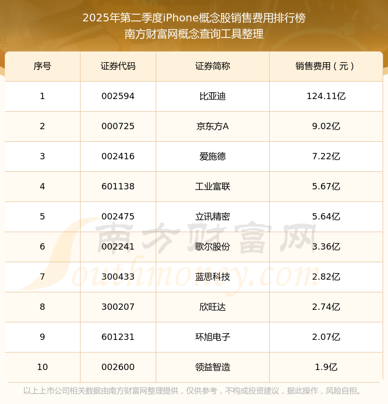 2025年第二季度,iPhone概念股销售费用排行榜中,比亚迪(002594)销售费用总额高达124.11亿,京东方A(000725)和爱施德(002416)位居第二和第三,工业富联(601138)、立讯精密(002475)、歌尔股份(002241)、蓝思科技(300433)、欣旺达(300207)、环旭电子(601231)、领益智造(002600)进入前十,销售费用总额分别排名第4-10名。