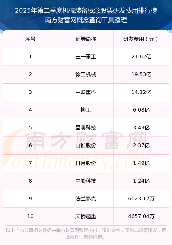 2025年第二季度机械装备概念股票研发费用排行榜如下:三一重工(600031)研发费用总额高达21.62亿,徐工机械(000425)和中联重科(000157)分别排名第二和第三,柳工(000528)、晶澳科技(002459)、山推股份(000680)、日月股份(603218)、中船科技(600072)、法兰泰克(603966)、天桥起重(002523)分别进入前十,其研发费用总额分别排名第4-10名。