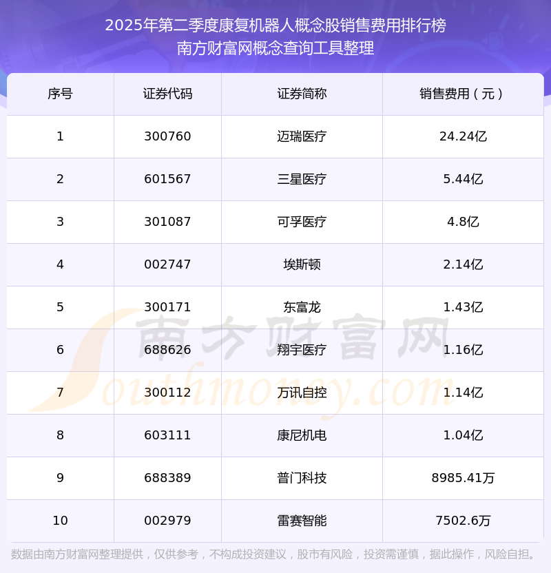 2025年第二季度康复机器人概念股销售费用排行榜如下:迈瑞医疗(300760)的销售费用总额高达24.24亿,三星医疗(601567)和可孚医疗(301087)分别位居第二和第三,埃斯顿(002747)、东富龙(300171)、翔宇医疗(688626)、万讯自控(300112)、康尼机电(603111)、普门科技(688389)、雷赛智能(002979)分别进入前十,其销售费用总额分别排名第4-10名。