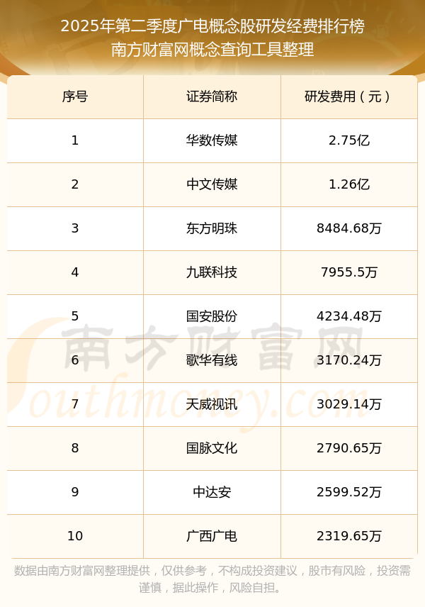 2025年第二季度,广电概念股研发经费排行榜中,华数传媒(000156)研发经费总额高达2.75亿,中文传媒(600373)和东方明珠(600637)位居第二和第三,九联科技(688609)、国安股份(000839)、歌华有线(600037)、天威视讯(002238)、国脉文化(600640)、中达安(300635)、广西广电(600936)进入前十,研发经费总额分别排名第4-10名。