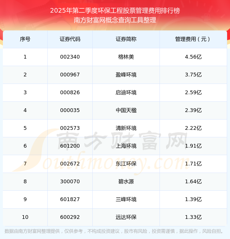 2025年第二季度,环保工程股票管理费用排名中,格林美(002340)的管理费用总额高达4.56亿,盈峰环境(000967)和启迪环境(000826)排名第二和第三,中国天楹(000035)、清新环境(002573)、上海环境(601200)、东江环保(002672)、碧水源(300070)、三峰环境(601827)、远达环保(600292)进入前十,其管理费用总额分别排名第4-10名。