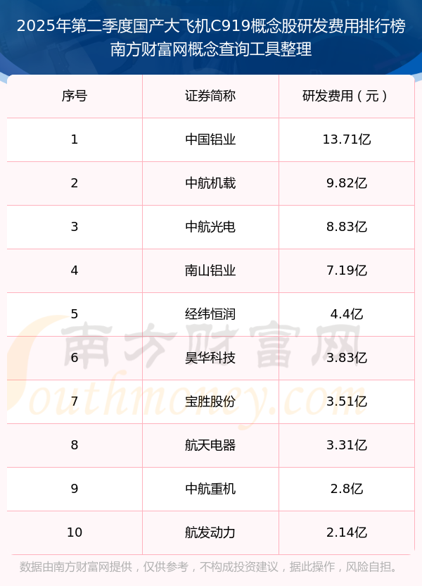 2025年第二季度,国产大飞机C919概念股研发费用排行榜中,中国铝业(601600)研发费用总额高达13.71亿,中航机载(600372)和中航光电(002179)位居第二和第三,南山铝业(600219)、经纬恒润(688326)、昊华科技(600378)、宝胜股份(600973)、航天电器(002025)、中航重机(600765)、航发动力(600893)进入前十,研发费用总额分别排名第4-10名。