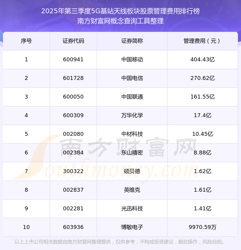 2025年第三季度,5G基站天线板块股票管理费用排行榜如下:中国移动(600941)的管理费用总额高达404.43亿,中国电信(601728)和中国联通(600050)分别排名第二和第三,万华化学(600309)、中材科技(002080)、东山精密(002384)、硕贝德(300322)、英维克(002837)、光迅科技(002281)、博敏电子(603936)分别进入前十,其管理费用总额分别排名第4-10名。