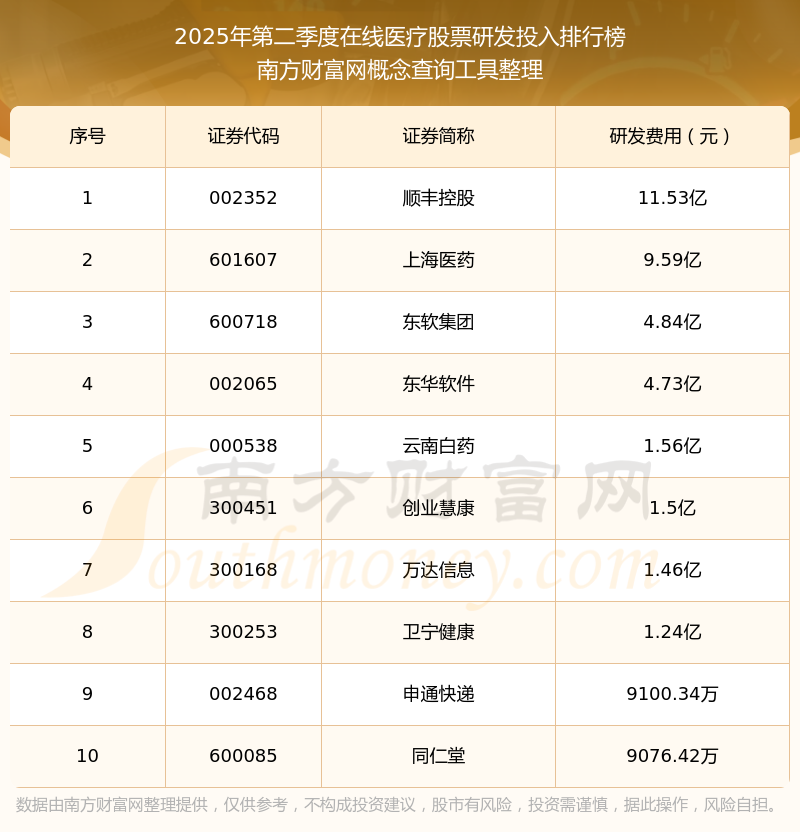 2025年第二季度在线医疗股票研发投入排行榜如下:顺丰控股(002352)研发投入总额高达11.53亿,上海医药(601607)和东软集团(600718)分别位居第二和第三,东华软件(002065)、云南白药(000538)、创业慧康(300451)、万达信息(300168)、卫宁健康(300253)、申通快递(002468)、同仁堂(600085)分别进入前十,其研发投入总额分别排名第4-10名。
