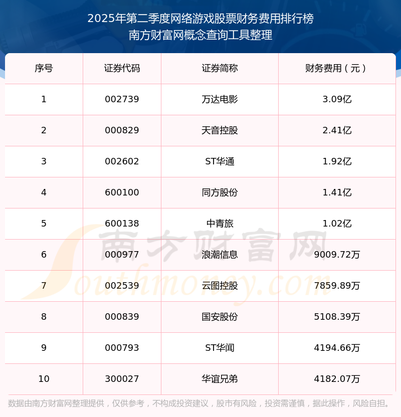 2025年第二季度网络游戏股票财务费用排行榜如下:万达电影(002739)的财务费用总额高达3.09亿,天音控股(000829)和ST华通(002602)分别位居第二和第三,同方股份(600100)、中青旅(600138)、浪潮信息(000977)、云图控股(002539)、国安股份(000839)、ST华闻(000793)、华谊兄弟(300027)分别进入前十,其财务费用总额分别排名第4-10名。
