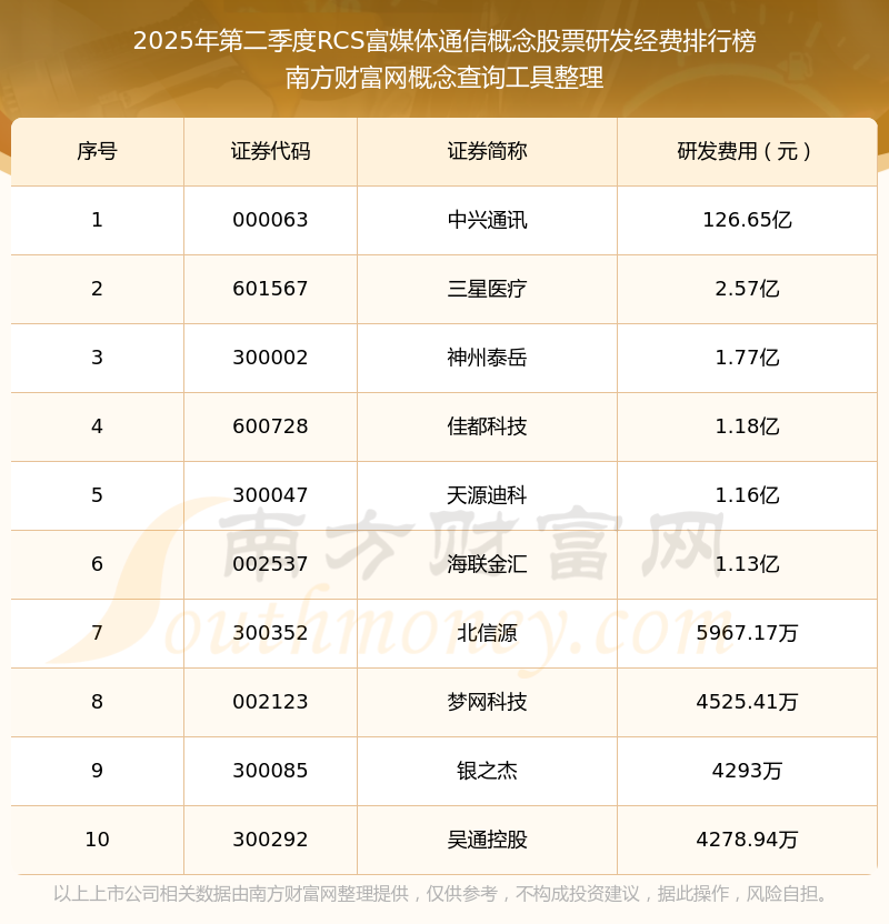 2025年第二季度,RCS富媒体通信概念股票研发经费排行榜中,中兴通讯(000063)研发经费总额高达126.65亿,三星医疗(601567)和神州泰岳(300002)位居第二和第三,佳都科技(600728)、天源迪科(300047)、海联金汇(002537)、北信源(300352)、梦网科技(002123)、银之杰(300085)、吴通控股(300292)进入前十,研发经费总额分别排名第4-10名。