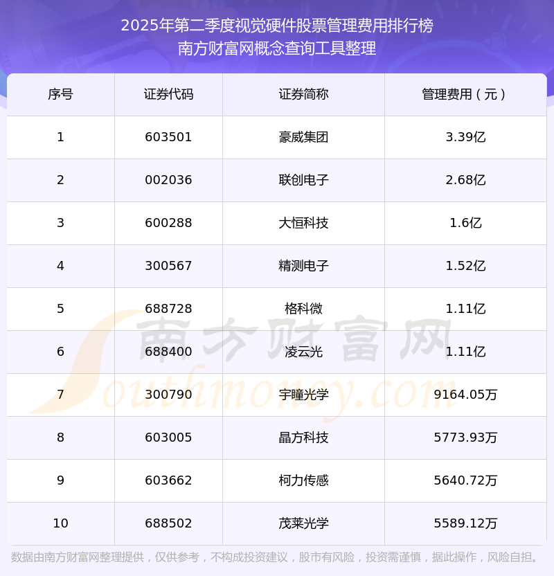 2025年第二季度,视觉硬件股票管理费用排行榜中,豪威集团(603501)的管理费用总额高达3.39亿,联创电子(002036)和大恒科技(600288)分别位居第二和第三,精测电子(300567)、格科微(688728)、凌云光(688400)、宇瞳光学(300790)、晶方科技(603005)、柯力传感(603662)、茂莱光学(688502)分别进入前十,其管理费用总额分别排名第4-10名。