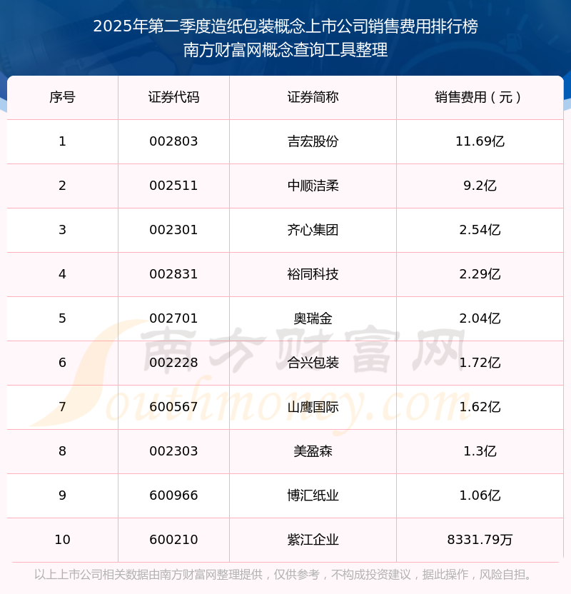 2025年第二季度,造纸包装概念上市公司销售费用排名中,吉宏股份(002803)销售费用总额高达11.69亿,中顺洁柔(002511)和齐心集团(002301)排名第二和第三,裕同科技(002831)、奥瑞金(002701)、合兴包装(002228)、山鹰国际(600567)、美盈森(002303)、博汇纸业(600966)、紫江企业(600210)进入前十,销售费用总额分别排名第4-10名。