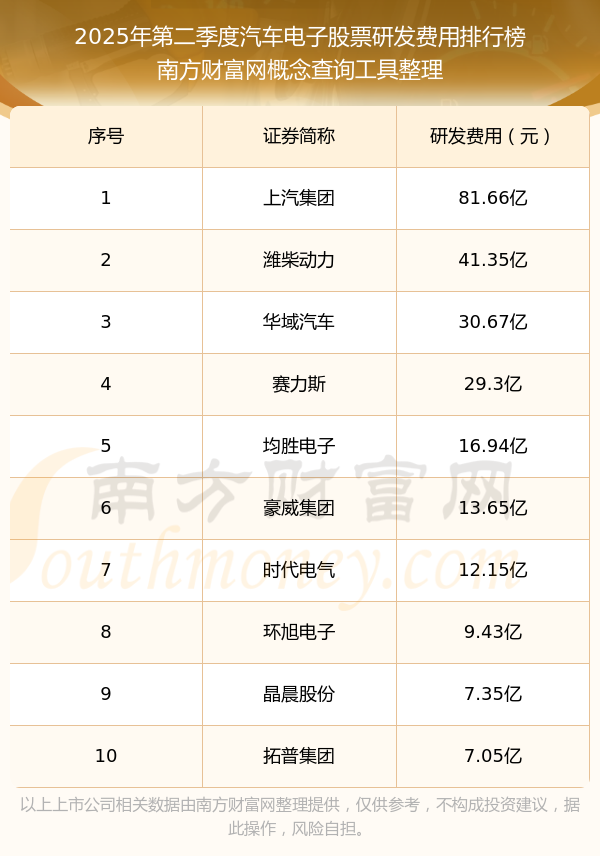 2025年第二季度汽车电子股票研发费用排行榜如下:上汽集团(600104)研发费用总额高达81.66亿,潍柴动力(000338)和华域汽车(600741)分别位居第二和第三,赛力斯(601127)、均胜电子(600699)、豪威集团(603501)、时代电气(688187)、环旭电子(601231)、晶晨股份(688099)、拓普集团(601689)分别进入前十,其研发费用总额分别排名第4-10名。