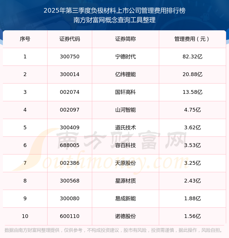 2025年第三季度,负极材料上市公司管理费用排名中,宁德时代(300750)的管理费用总额高达82.32亿,亿纬锂能(300014)和国轩高科(002074)排名第二和第三,山河智能(002097)、道氏技术(300409)、容百科技(688005)、天原股份(002386)、星源材质(300568)、易成新能(300080)、诺德股份(600110)进入前十,其管理费用总额分别排名第4-10名。