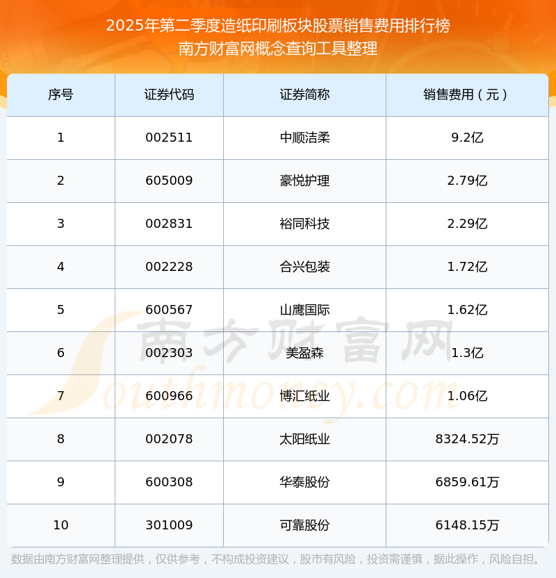 2025年第二季度造纸印刷板块股票销售费用排行榜如下:中顺洁柔(002511)的销售费用总额高达9.2亿,豪悦护理(605009)和裕同科技(002831)分别位居第二和第三,合兴包装(002228)、山鹰国际(600567)、美盈森(002303)、博汇纸业(600966)、太阳纸业(002078)、华泰股份(600308)、可靠股份(301009)分别进入前十,其销售费用总额分别排名第4-10名。
