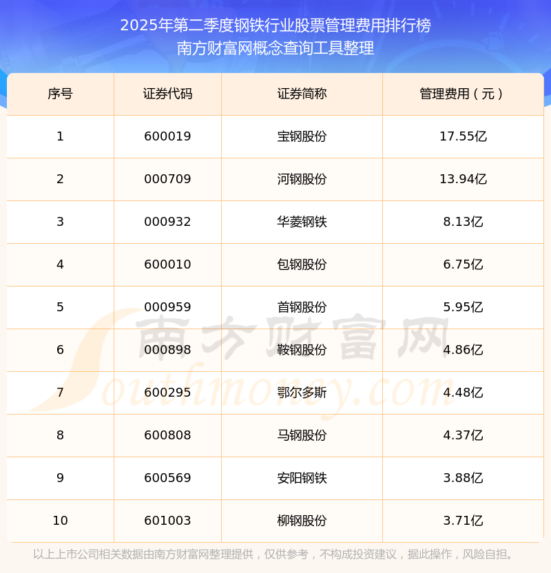2025年第二季度,钢铁行业股票管理费用排行榜如下:宝钢股份(600019)的管理费用总额高达17.55亿,河钢股份(000709)和华菱钢铁(000932)分别排名第二和第三,包钢股份(600010)、首钢股份(000959)、鞍钢股份(000898)、鄂尔多斯(600295)、马钢股份(600808)、安阳钢铁(600569)、柳钢股份(601003)分别进入前十,其管理费用总额分别排名第4-10名。