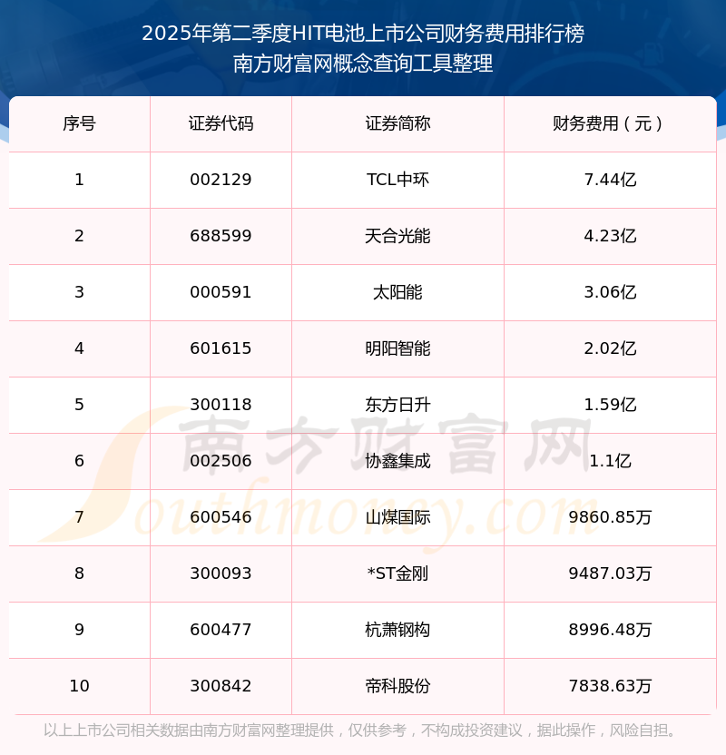 2025年第二季度,HIT电池上市公司财务费用排行榜中,TCL中环(002129)财务费用总额高达7.44亿,天合光能(688599)和太阳能(000591)位居第二和第三,明阳智能(601615)、东方日升(300118)、协鑫集成(002506)、山煤国际(600546)、*ST金刚(300093)、杭萧钢构(600477)、帝科股份(300842)进入前十,财务费用总额分别排名第4-10名。