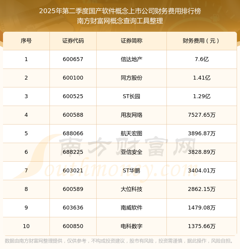 2025年第二季度,国产软件概念上市公司财务费用排行榜中,信达地产(600657)财务费用总额高达7.6亿,同方股份(600100)和ST长园(600525)位居第二和第三,用友网络(600588)、航天宏图(688066)、亚信安全(688225)、ST华鹏(603021)、大位科技(600589)、南威软件(603636)、电科数字(600850)进入前十,财务费用总额分别排名第4-10名。