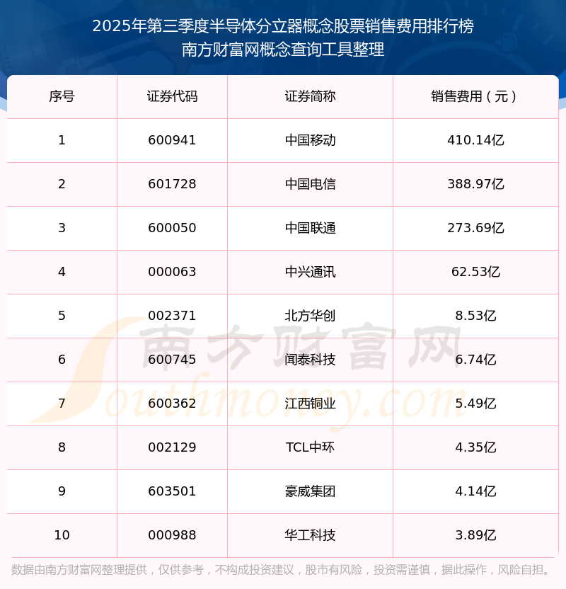2025年第三季度,半导体分立器概念股票销售费用排名中,中国移动(600941)销售费用总额高达410.14亿,中国电信(601728)和中国联通(600050)排名第二和第三,中兴通讯(000063)、北方华创(002371)、闻泰科技(600745)、江西铜业(600362)、TCL中环(002129)、豪威集团(603501)、华工科技(000988)进入前十,销售费用总额分别排名第4-10名。