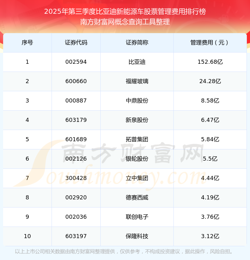 2025年第三季度,比亚迪新能源车股票管理费用排行榜中,比亚迪(002594)的管理费用总额高达152.68亿,福耀玻璃(600660)和中鼎股份(000887)分别位居第二和第三,新泉股份(603179)、拓普集团(601689)、银轮股份(002126)、立中集团(300428)、德赛西威(002920)、联创电子(002036)、保隆科技(603197)分别进入前十,其管理费用总额分别排名第4-10名。