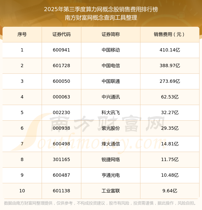 2025年第三季度,算力网概念股销售费用排行榜中,中国移动(600941)销售费用总额高达410.14亿,中国电信(601728)和中国联通(600050)位居第二和第三,中兴通讯(000063)、科大讯飞(002230)、紫光股份(000938)、烽火通信(600498)、锐捷网络(301165)、亨通光电(600487)、工业富联(601138)进入前十,销售费用总额分别排名第4-10名。