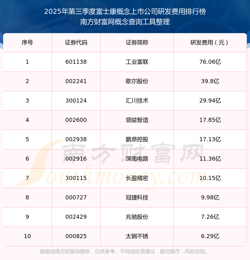 2025年第三季度,富士康概念上市公司研发费用排行榜中,工业富联(601138)研发费用总额高达76.06亿,歌尔股份(002241)和汇川技术(300124)排名第二和第三,领益智造(002600)、鹏鼎控股(002938)、深南电路(002916)、长盈精密(300115)、冠捷科技(000727)、兆驰股份(002429)、太钢不锈(000825)进入前十,研发费用总额分别排名第4-10名。