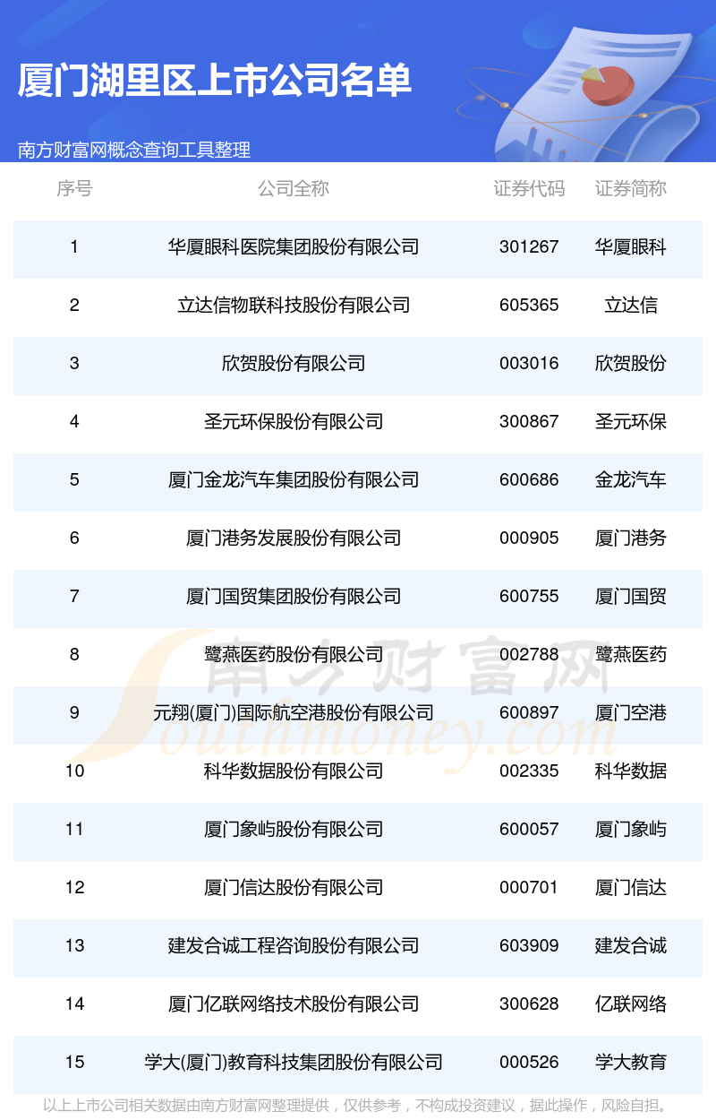 数量上,截至12月5日,厦门湖里区共有15家A股上市公司。具体分布为,上交所:厦门象屿、金龙汽车、厦门国贸、厦门空港、建发合诚、立达信等6家,深交所:学大教育、厦门信达、厦门港务、科华数据、鹭燕医药、欣贺股份、亿联网络、圣元环保、华厦眼科等9家。