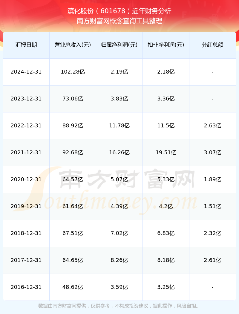 2024年报显示,滨化股份实现营收102.28亿,同比增长-42.77%;毛利率7.34%。