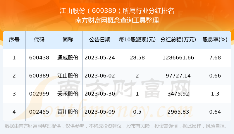 按照南方财富网趋势选股系统统计,江山股份所属行业为农药行业,农药行业分红排名情况如下表:
